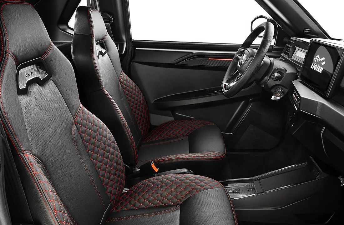 Ultimate-Sitze aus veganem Leder, mit roten Nähten, Kopfstützen aus Carbonfaser und Ligier-Logo