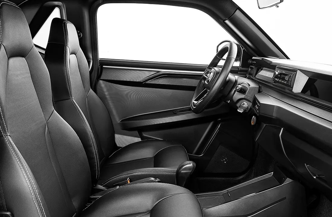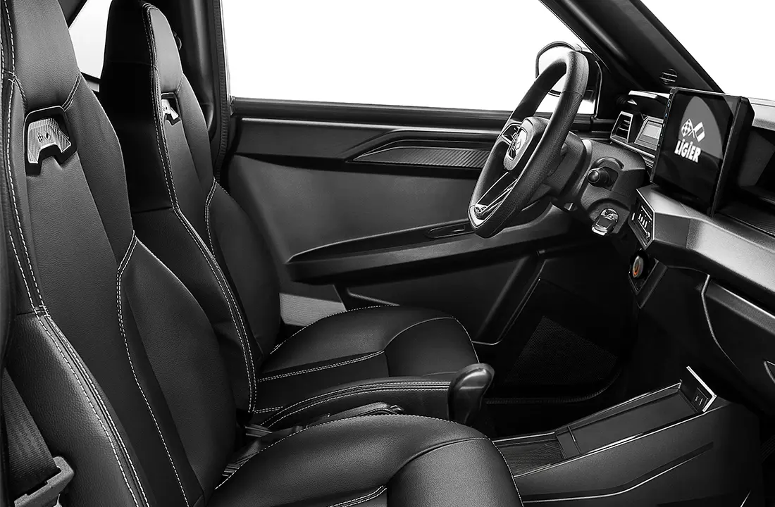 – Hochwertige Sitze aus veganem Leder, elfenbeinfarbene Nähte, Kopfstütze mit Karbonstruktur und Ligier-Logo